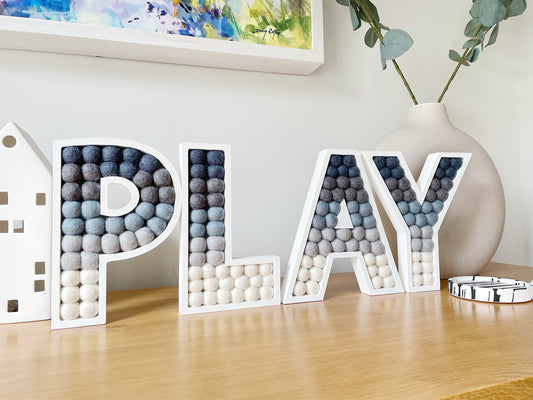 4 Letter Word Grey Pom Pom Letters. LOVE, PLAY, HOME - 20cm